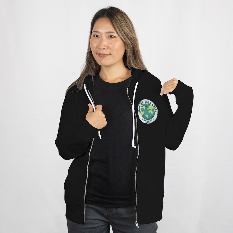 Support Your Local Planet – Zip-Hoodie mit Frontprint, unisex in schwarz oder weiß. Ein Statement zum Schutz unserer Umwelt!